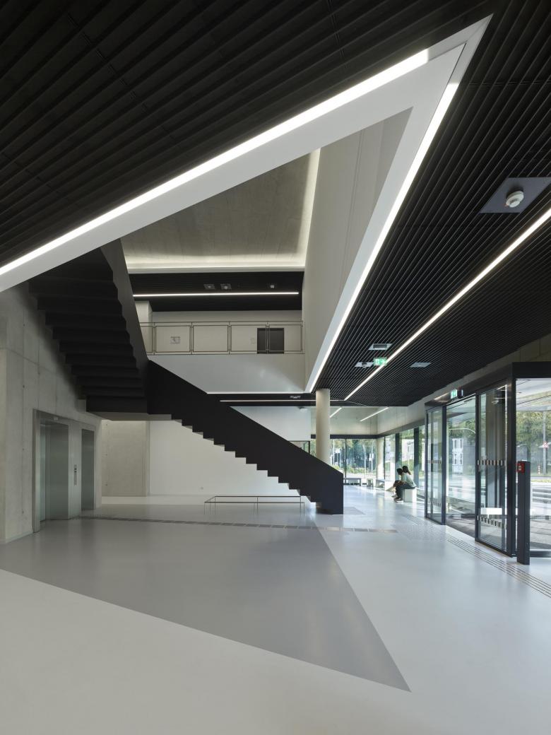 The ribbon facades are only transparent where the rooms behind demand daylight. Some windows have perforated aluminum screens in front of them while others have kinetic louvers that can be raised and lowered. At 51% opacity, the perforations still allow for views out and lots of daylight. Some seminar rooms actually have views of Aachen’s world-famous cathedral, the UNESCO World Heritage site that Emperor Charlemagne had built in the year 796. The building has no rear, but it has dynamic elevations all around. Tectonically, diagonal tension members express the cantilever to those inside the building.