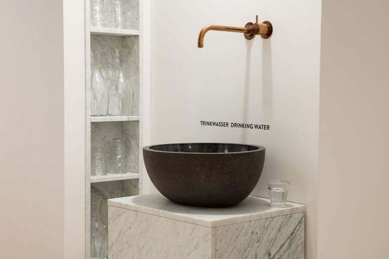 When you have a building like [Hotel Marktgasse] it doesn’t need much. It’s a risk to destroy something like this. With a new building it’s more difficult to create something unique. Everything in hospitality meshes together: Where do the guests come from? What is the type of chain? Where is the building located? What are the restaurant types? Where is the food coming from? A hotel is a very complex system. To be unique, you have to look at every corner of everything and make it special: the food, the quality of the rooms, little details like the water from the tap [photo below] – the little things where you sense somebody took some care. It’s individual and you feel treated like an individual. That makes a hotel unforgettable. You probably remember the last five hotels you’ve been in. There might be one where you feel, “that was special,” but then forgot the others.