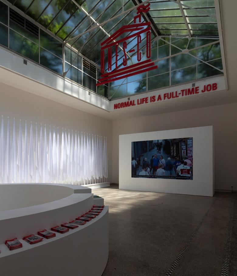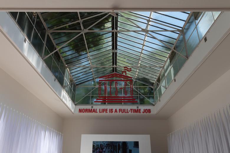The title of the Czech and Slovak Pavilion is clearly a play on UNESCO, the United Nations Educational, Scientific and Cultural Organization, which is based in Paris and each year adds natural and cultural sites to its ever-growing World Heritage List. Both Český Krumlov, in the Czech Republic, and Venice are on the list. Although quite different in terms of physical character and familiarity, each city suffers from too many tourists and not enough residents. To draw attention to the remote Czech town of 13,000 residents, artist Kateřina Šedá turned the pavilion in the Giardini into an official-looking headquarters of an entity aimed at infusing "normal life" into the town center drained of its residents since it gained heritage status in 1993. Videos and a catalog respectively show the people hired to act normally and explain the background of the project.
