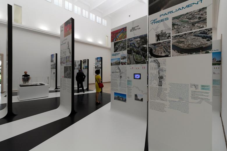 Theme and exhibition design are strongly integrated in Unbuilding Walls. Three of the curators are partners at GRAFT, and their design sensibility infuses the exhibition, which is simply one black slab concealing the entrance to the German Pavilion (photo above). Once inside (photo below), the exhibition appears to be just a black wall, perhaps a commentary on the Berlin Wall, which has been down for 28 years, the same amount of time it existed. But the subtle shifts in shade hint at the fact the "wall" is in fact porous, an optical illusion that is revealed as freestanding walls placed in various rows upon the painted, sloped floor. It's an exhibition that visitors can move through merely for fun, in the vein of the Swiss Pavilion, yet each freestanding wall is host to the presentation of a project related to the theme of walls, both in Germany and beyond.