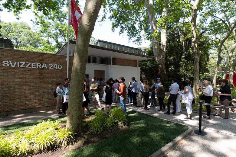 On the morning of the Biennale's opening day last month the winners of the various Lions were announced. I was in the Giardini watching the awards ceremony on a giant screen near both the main entrance and the Swiss Pavilion, which erupted in some mild cheers when it was awarded the Golden Lion for Best National Participation. A line formed almost immediately (photo above), but such a thing — more akin to a theme park than an architecture exhibition — was common during the Vernissage as well. Only a certain number of people were admitted to the interior at any one time, given that instead of drawings on the walls or models in space, Svizzera 240 is the pavilion itself, cut up into various rooms that take generic residential spaces and then push and pull them into various scales both smaller and larger than the norm. Playful and cerebral yet free of wall text or anything else to interfere with bodies moving in space (the jury described it as "a compelling architectural installation that is at once enjoyable while tackling the critical issues of scale in domestic space"), it's easy to grasp why it was selected for the Golden Lion — and why I can't look at photos of empty residential interiors the same since.