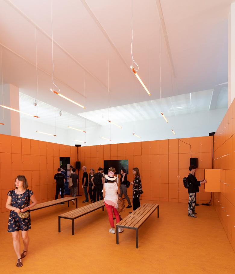 On the first day of the two-day Vernissage, architectural historian and theorist Beatriz Colomina donned pajamas and over the course of four hours interviewed architects and other thinkers in bed. The Bed-In Interviews were modeled on John Lennon and Yoko Ono's famous bed-in, which first took place at a hotel in Amsterdam right after they got married. Visitors to the Dutch Pavilion now see an uninhabited room set up to look like the hotel, complete with handwritten signs on the windows and a guitar on the bed. Colomina explores the bed as a place of work in an essay in the catalog to Work, Body, Leisure, a must in the case of this cerebral pavilion. Although her contribution — and those in the other rooms that are discovered by opening the various orange doors in the locker room-like space that greets visitors — is greatly aided by the additional reading material, the interactivity of the pavilion is refreshing and, like the Swiss Pavilion, fun.
