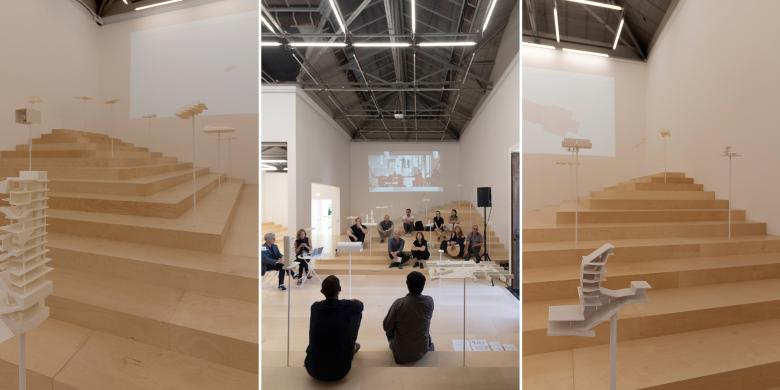 The most common format for national participations during the Venice Architecture Biennale is an exhibition of drawings, photographs and models of buildings produced by architects from that country, usually assembled under a theme that expresses the preoccupations of the architects or curators at that particular moment. Greece's pavilion rounds up a bunch of projects, but it does so across time and geography, making it about an idea that originated in the country and spread throughout the world. Consisting of abstracted models of buildings propped on slender supports and spread across a landscape of steps, The School of Athens hones in on the common spaces ("freespaces") of educational buildings, the spaces that are increasingly seen — and designed — as important places of interaction and innovation outside of the classroom. Such projects as Weiss/Manfredi's Diana Center at Barnard College embody this notion; in fact, Marion Weiss and Michael Manfredi spoke in the pavilion as part of a symposium on opening day (photo below), clearly expressing how the layout of the space aligns with its theme.