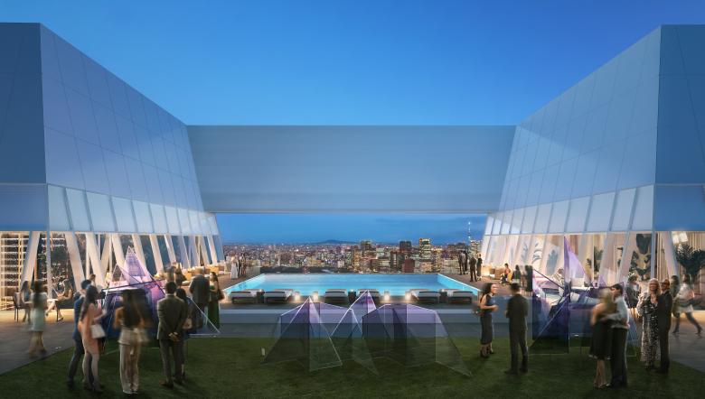 At the other end of the 266-meter-tall tower, the top is called TOKYO NODE; it will be a “communication facility” on the 45th to 49th floors that will consist of halls, galleries, and restaurants. The main hall will seat 338 people for performances that combine “staging and virtual delivery.” The adjacent three galleries can be integrated as one, and the rooftop can be combined with the halls and galleries “for fashion shows and garden parties.” These spaces will overlook a sky garden with an infinity pool and more restaurants.