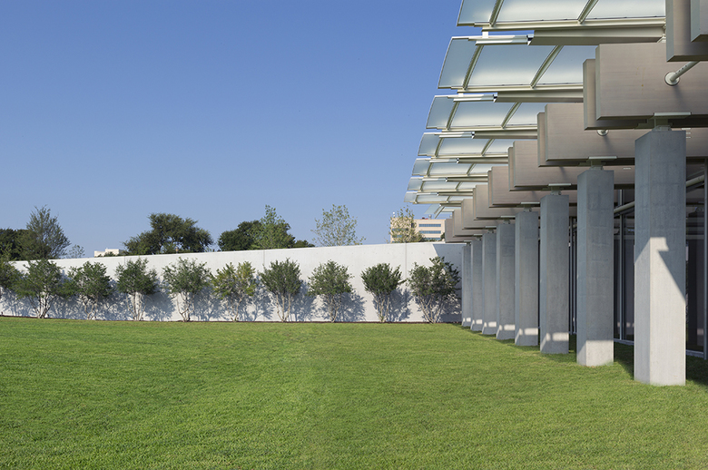 The Kimbell’s second big decision was not to let the new building touch Kahn’s. Instead, the so-called Piano Pavilion faces the Kahn building across what’s left of its front lawn (still an imposing two acres or so of grass). Visitors now enter through a parking lot below the lawn, and ascend (by elevator or stairs) to the portico of the new building. From there, they walk across that lawn and then through a grove of yaupon holly trees to Kahn’s original lobby. Like a cathedral’s steps (but ADA-compliant), the walk delays gratification.