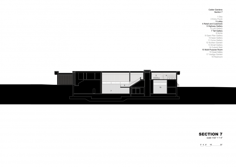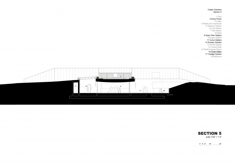 The disc shape of the plaza is evident at this lowest level in curved walls but also lines in the ceiling and overhangs at windows. While the generous space of the Open Plan Gallery beneath the disc would seem to be the culmination of a visit to Calder Gardens, views to the outdoors, streams of daylight entering the gallery, and hints of spaces around walls beckon one to continue. Clearly, as Herzog writes in the catalog of his sketches, the building “[allows] for the works of art to express their incredible diversity and ambiguity within numerous different spatial contexts.” The spaces that extend from the Open Plan Gallery include the dramatically top-lit Apse Gallery; the inaccessible Sunken Gallery and, surrounding it, the Curve Gallery that wraps to a niche with art by Calder's mother, father, and grandfather; the covered outdoor Quasi Gallery and, adjacent to it, the Vestige Garden, so named because it geometry is a ghostly reminder of the urban plots that predated the construction of the parkway.