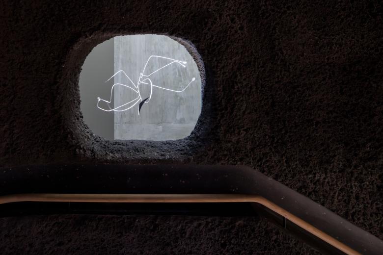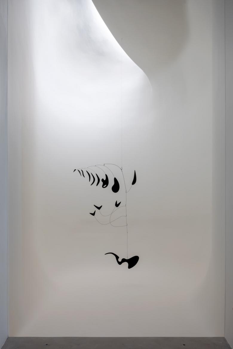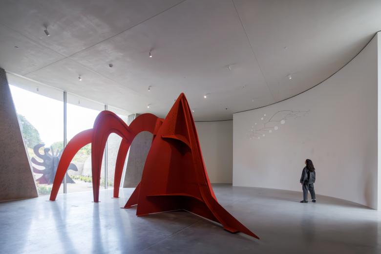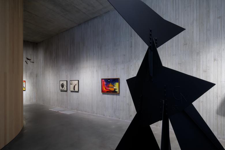 The path downward takes another 180-degree turn, to a dark stair lined in what Herzog explains is nagelfluh: “concrete walls with rock aggregates that look like natural stone.” It is visitors' first, but not last, encounter with the material, but here the effect is simultaneously eerie yet exhilarating, because off the landing of the dark Cuboid Stair is a softly illuminated niche with a small Calder mobile. It is hard not to stop here and take a momentary pause in the building's architecturale promenade. Stepping off the stair and onto the polished concrete floor of the gallery level, natural light draws visitors to the left, toward the numerous spatially named galleries (Low Gallery, Tall Gallery, Open Gallery) and the appropriately sized artworks within them. Free of wall text or handouts, the formal aspects of the Calders and how they relate to the spaces take priority over historical, curatorial, or other meanings. Per the institution, the installations will rotate over time, such that “Calder’s art will come and go in waves: a slow process of change that encourages close looking and repeat visits.”