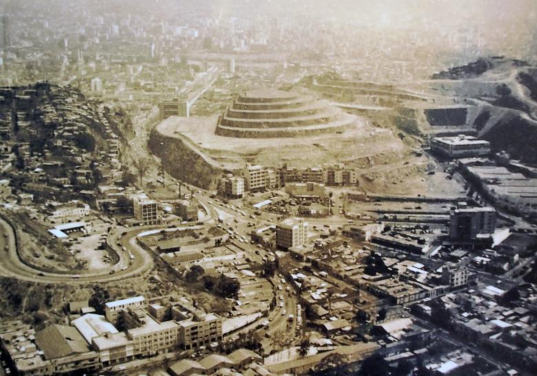 Construction of El Helicoide de la Roca Tarpeya, 1956-57. The hill was cut, terraced, and then used as the base for the concrete structure. (Photographer unknown)
