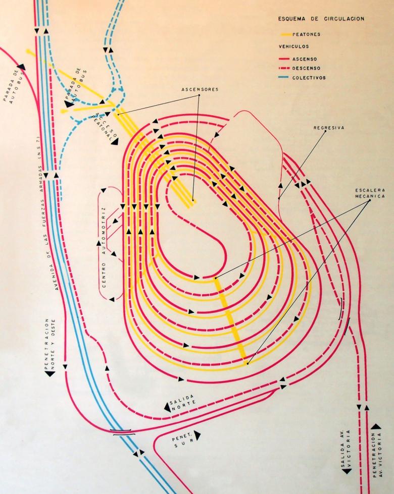 Line drawing of vehicular circulation in sales brochure for El Helicoide de la Roca Tarpeya, ca. 1958