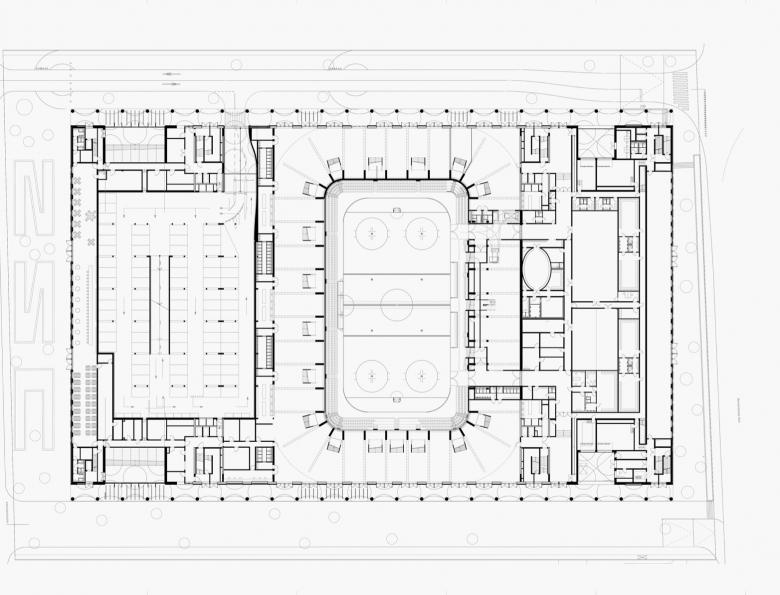 Back in 2013, Caruso St John won the competition to design Switzerland’s best venue for hockey largely because of their choice of material — concrete, always popular with the Swiss — and the unusual layout of the building. The rink in the middle of the plan is set perpendicular to the long sides of the site, where access to the main entrances is found — not expressed architecturally and thus hard to find.