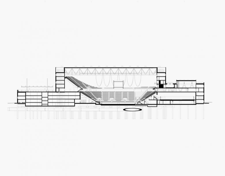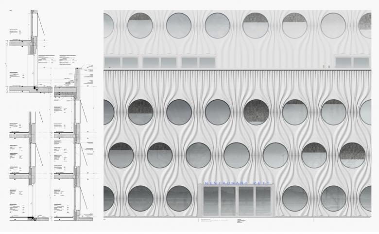 Dark round concrete columns along the arcades on the long sides carry the beige-colored facades above that the architects call “a curtain cast in concrete.” This textile-like shell strives to appear playful, like Schinkel’s tent-architecture inside Charlottenhof Palace in Potsdam — a reference actually mentioned by the architects. In reality the hundreds of convex concrete parts look heavy, clumsy. Porthole windows that resemble pucks are punched into the facades on the short ends, behind which are offices and around which the concrete “fabric” bunches. A concrete curtain, it appears, may not be a recipe for architectural elegance.
