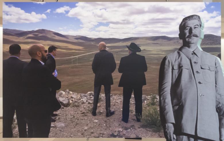 ▲ Number of robotic figures moving around the top ramp ▼Cutouts of an ancient sheepherder, a photograph of Joseph Stalin, and a painted Eve reaching for an apple greet visitors on the top ramp. Up here, large photographs predominate in this last section of the exhibition, but they are mixed with three-dimensional displays of pixel farming and other high-tech developments being implemented in the countryside.