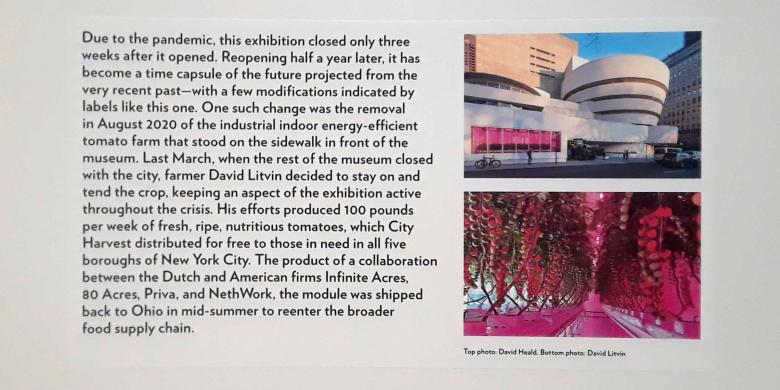 ▲ Pounds of tomatoes harvested every week in the Indoor Grow Module parked in front of the Guggenheim ▼According to a new piece of wall text, "Last March, when the rest of the museum closed with the city, the farmer David Litvin decided to stay on and tend the crop, keeping an aspect of the exhibition active throughout the crisis. His efforts produced 100 pounds per week of fresh, ripe, nutritious tomatoes, which City Harvest [a non-profit that supplies food pantries] distributed for free to those in need in all five boroughs of New York City."