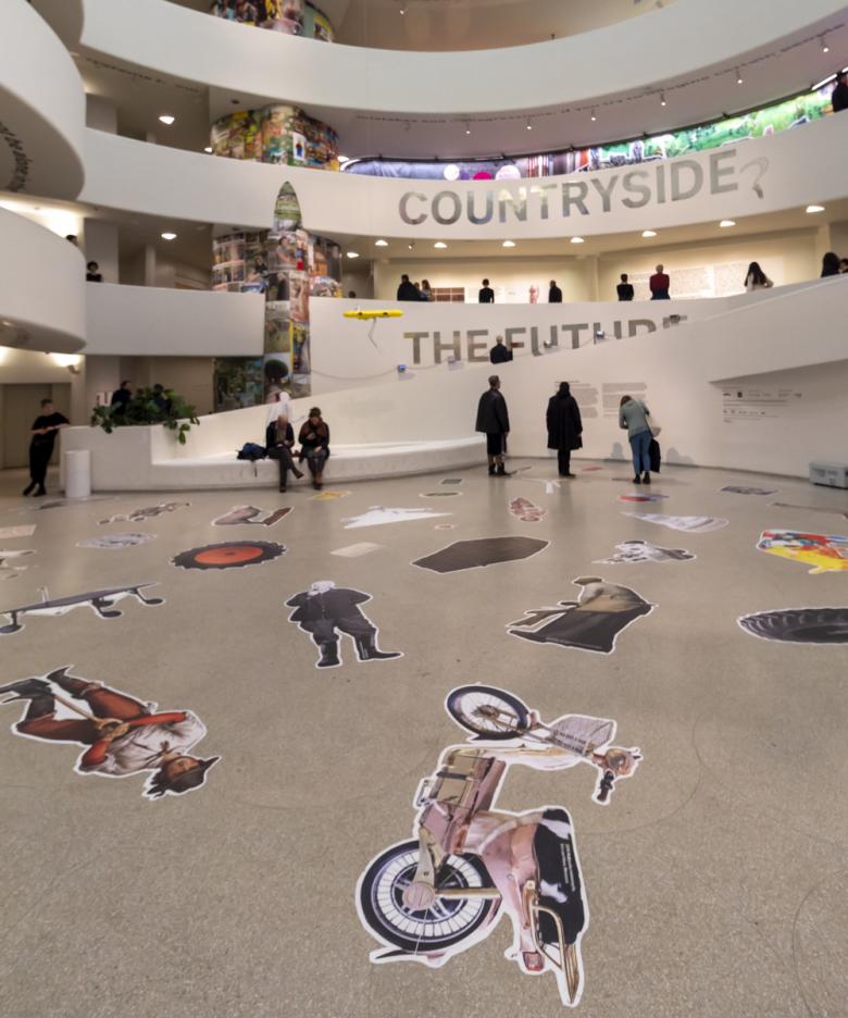 ▲ Approximate number of cutouts that comprise the exhibition's "Unswept Floor" ▼Inspired by the asàrotos òikos, or unswept floor, common in ancient Greek and Roman dining rooms, the floor of the Guggenheim's rotunda is covered with "remnants of the intellectual feast" that is Countryside. There are tractor tires, figures extracted from pastoral scenes, and animals among the "overabundance of material from the ramps of the rotunda."