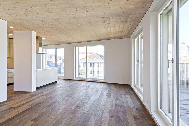 The last of the five projects highlighted here is the most urban, situated in the center of Zürich. It is made up of two six-story buildings, one residential and one commercial, that look at each other across a shared courtyard. Stair and elevator cores were constructed from concrete and the exterior walls were made from prefabricated timber panels with glulam and LVL pieces. But most exceptional are the floors, which are a prefabricated composite wood and concrete system that results in higher ceilings than wood-only floors. This hybrid system enabled the elimination of the steel reinforcing typical of concrete floors, thereby eliminating the embodied energy that comes with the manufacturing of steel.