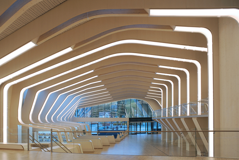 Yet the Pulpit Rock Mountain Lodge is not the only Helen & Hard project in the book; it is followed by the Vennesla Library, completed a few years later in Vennesla, Norway. A similar parti of repeating ribs is found in the library, but here executed in glulam rather than doweled panels. Most interesting, as Mayo told me, is that there are 27 unique sectional shapes in the building, which reveals the adaptability and formal expression available with wood.