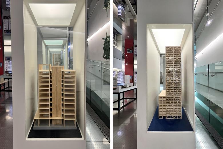Framework is one of three scale models in the museum's vitrines (left in below photo). The other two are Perkins&Will's River Beech Tower, a research project for an 80-story tower that would be made with CLT floors, an LVL diagrid, and GLT walls and cross-bracing, and Proto-Model X (PMX), a 35-story mixed-use tower that Gensler designed for Sidewalk Labs' aborted Quayside Toronto development (right in below photo). Gensler released its design for the cross-braced timber tower in January 2020, two months before the Covid quarantine and four months before Sidewalk Labs abandoned the Quayside project; in fact, most of the projects in Tall Timber, including all of the ones mentioned above, date to before the pandemic. A tall timber audit by the CTBUH (Council on Tall Buildings and Urban Habitat) sensibly shows a steep drop in the number of mass timber buildings eight stories or more in 2020, but more telling is how completions in the years since, although they have rebounded, are still far short of pre-pandemic levels, particularly 2017–19. Of course, the number of tall buildings in wood is small compared to those framed in steel and/or concrete.