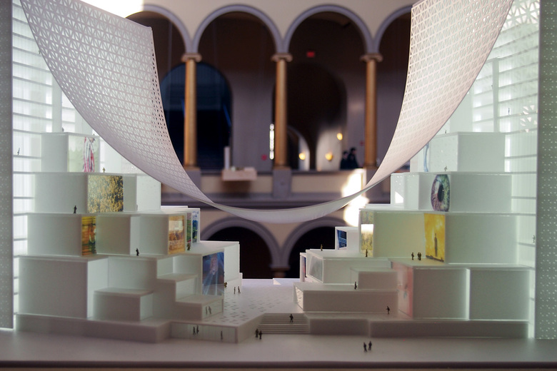 The "architectural odyssey" proper starts to the right of the two NBM projects with a media headquarters designed for somewhere in the Middle East. BIG's "Magic Carpet" moniker might sound like a caricature at first blush, but it is fitting, since the most striking gesture is a tensile membrane that is draped from one tower slab to an identical one set at a slight angle. This gesture, one of the first images encountered by museum visitors, is a strong illustration of how Ingels and his team find inspiration in the climate-responsive vernacular of a place. Stacked boxes sit below the "carpet" and are shaded be the patterned openings of the roof tiles to create usable outdoor spaces for the hot desert climate.