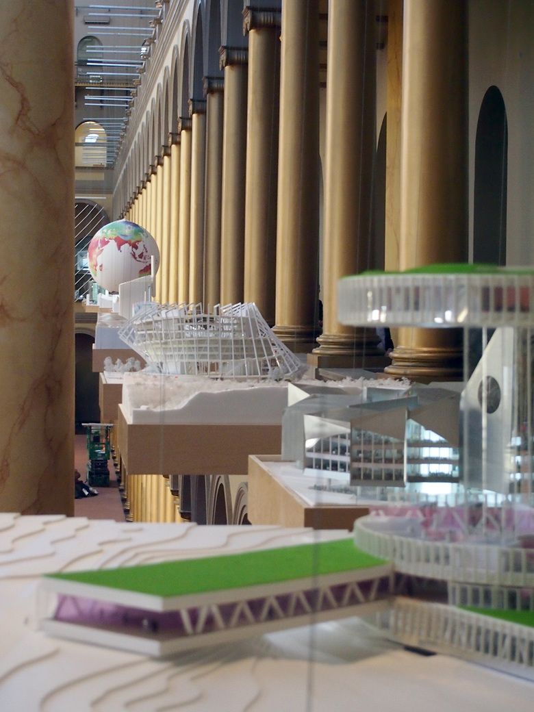 Another exclamation point, if you will, happens at the midway point of the short, east end of the atrium, where numerous models for the Rockefeller City-inspired Rose Rock Financial Center for Tianjin are displayed. The models – one of them at least 10 feet high – seem to play with the eight large columns of the NBM atrium, as seen in the photo above. This visual effect would not work if the project fell somewhere else within the HOT TO COLD spectrum, so I contend that the projects are located for impact as much as they are the result of scientific data about climate. How else to explain that a number of Copenhagen projects fall at about the midway point of the exhibition (in the green colors), but the city's Amager Resource Center is the last, and therefore coldest, project? As we'll see it's about making a statement.