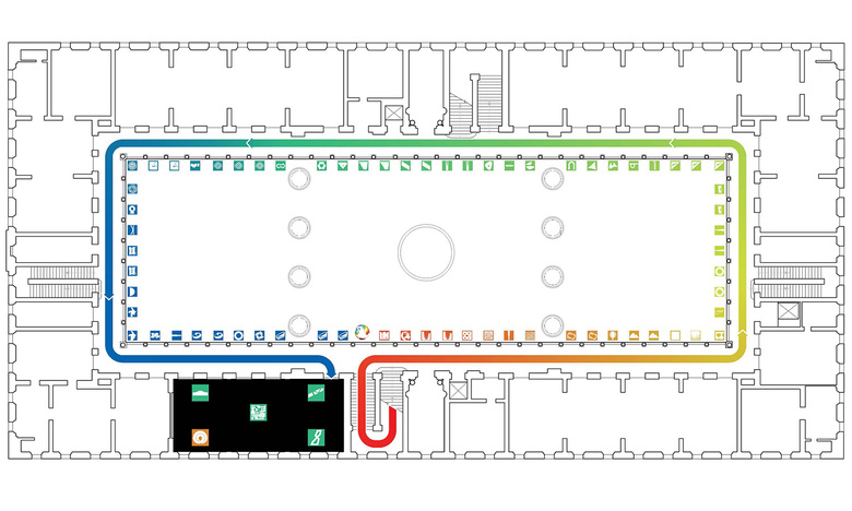 Exhibition layout, showing the counterclockwise path from HOT TO COLD and the darkened side gallery with videos at the end of the 800-foot lap. Image courtesy of BIG/NBM