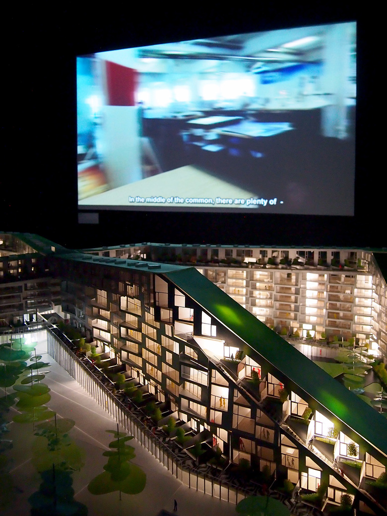 Large illuminated model of 8 House with film by Beka & Partners on the wall