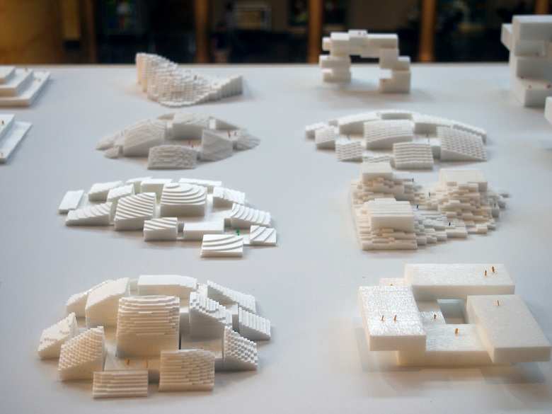 Having written "foam cutter" instead of "drawing board," I should probably say a few words about BIG's models. A visit to BIG's website yields project explanations built around step-by-step diagrams that convince us that the somewhat odd design we are looking at is the outcome of logical responses to certain factors, be it sun, wind, temperature, culture, or economics. Yet HOT TO COLD plays down the diagrams in favor of the models – most of them in foam – that hang in the atrium and invite us to subtly lean over the displays of renderings to get a closer look. The models, which are lost like pixels when seen from below, are the strongest parts of the exhibition upstairs. Just out of reach, they are nevertheless the most understandable things on display, giving visitors three dimensions of appreciation.