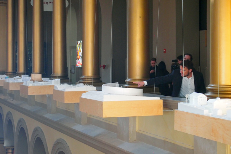 Bjarke Ingels giving the press a tour of the exhibition a couple days before opening day