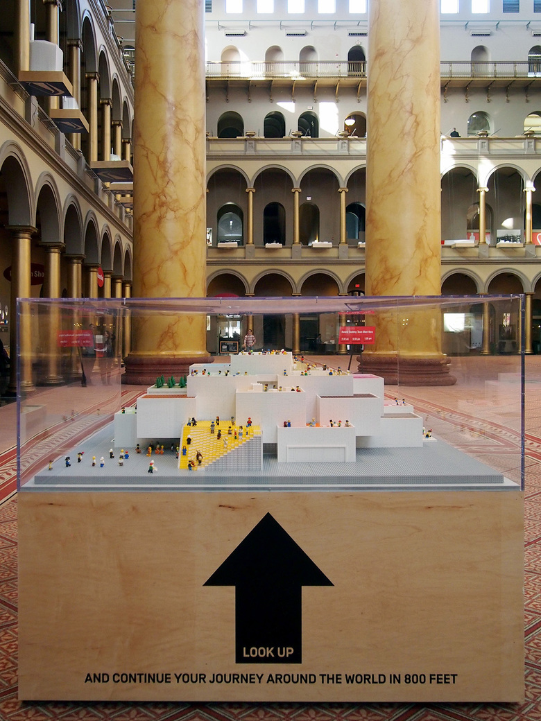 Yet the scale of the BIG's exhibition is hardly felt upon entering the museum. A few steps past the south entrance sits a LEGO model of the LEGO House now under construction in Denmark; it, and virtual reality goggles that immerse visitors in last year's BIG Maze, are the only exhibition pieces on the museum's ground floor. The base of the large LEGO model instructs visitors to "look up and continue your journey around the world in 800 feet," the diameter of the second-floor arcade where the projects are displayed.