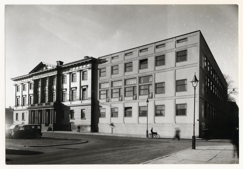 Another case study — a two-in-one instance — is illustrated here: Boekentoren and State Archives in Ghent, both designed by Robbrecht en Daem Architecten, are examples of mirror. Precedents for this approach include, among others, Venturi, Scott Brown and Associates' Sainsbury Wing (1991) at the National Gallery in London; The Barnes Foundation in Philadelphia, which was moved in 2012 from the residence of Albert C. Barnes to replica rooms in a building designed by Tod Williams Billie Tsien Architects; and Gunnar Asplund's modern mirror of the Beaux-Arts city hall in Gothenburg, Sweden, completed in 1936 (pictured above).