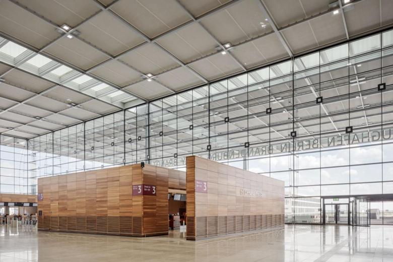 Another critique is that the building has no feel of flying at all. Quite true, BER does not begrudge the aircrafts their dynamic shape. It is rationalistic, has more of Brandenburg and Berlin, of Schinkel and Mies van der Rohe — and perhaps a little technicism from Norman Foster's Stansted Airport. It is not signature architecture or a spectacular landmark, but it is serious, well thought-out, functional architecture, which will nevertheless stick in the memory of foreign travelers. This is because, like the Tegel Airport but naturally not on the same scale, BER is an airport of short distances by international standards. And it offers a maximum of orientation: views into, out of and through the building, which provide security for passengers who are already stressed out. Passengers will always know where they are and where the route leads them; they will not, as is often the case, be solely dependent on a wayfinding system.