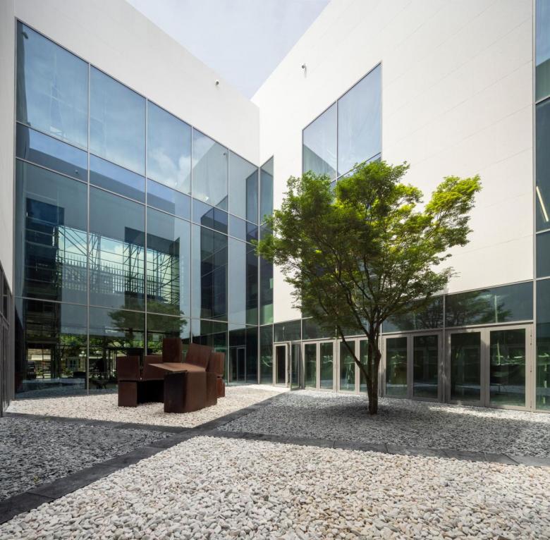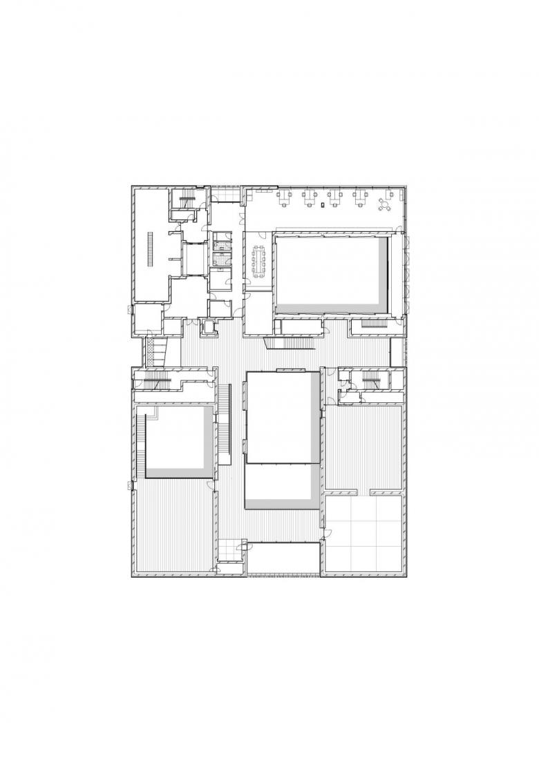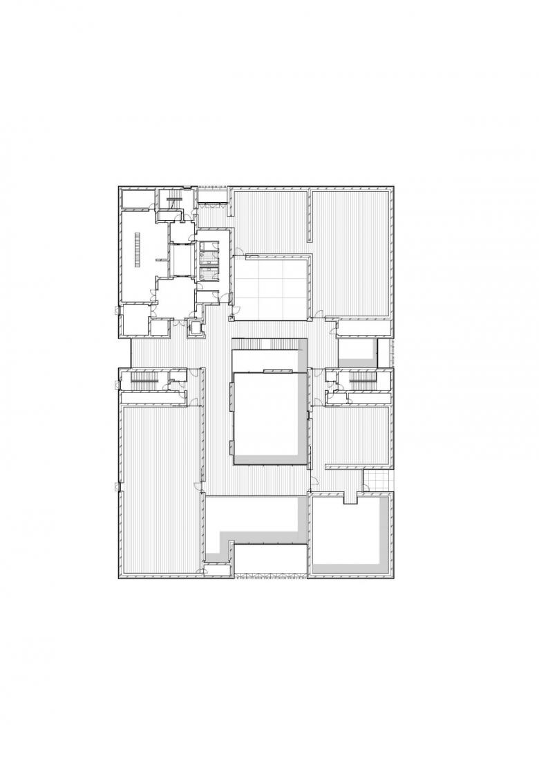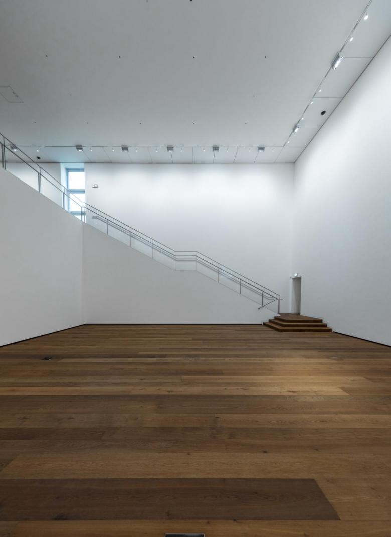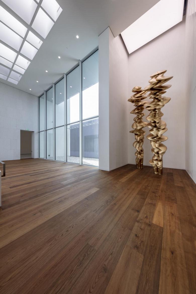 In a corner of the upper floor, a two-part monumental sculpture by Tony Cragg, for which the location had been specially planned, takes visitors by surprise. A crane had hoisted the object over the roof. Well secured and wrapped, it survived the rest of the construction period. The site for a large sculpture by Eduard Chillida weighing several tons and wreathed in the inner courtyard also had to have a special foundation for the heavy load.