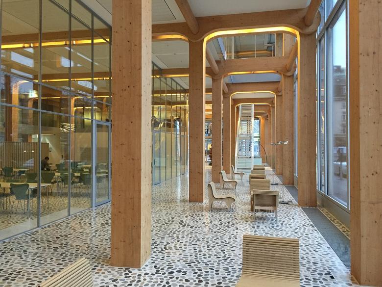 I made the Tamedia and Swatch buildings in Switzerland in timber, but I could not do that in Japan. I combine the tubular effect of CLT for bending and lateral forces. The wooden formwork remains in place. It is the final finish, so it looks like a wooden building.