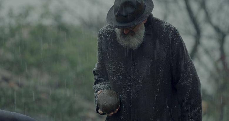 Yet, between the slow-motion rock slides, steel teeth grinding up stones, scenes of destruction in Ukraine and Turkey, and dozens of trucks lined up to dump rubble into a landfill are idyllic scenes of De Lucchi—hermit-like with his long gray beard, long brown coat, and wide-brimmed hat keeping the rain and snow off his face—directing two stonemasons to inscribe a circle in his lawn. The scale of De Lucchi's creation is minuscule, insignificant compared to that of the environmental and physical destruction portrayed throughout the rest of the film. As the only architect in a film about the way humans are harming the Earth through the production of buildings, De Lucchi's presence is a bit of a conundrum.