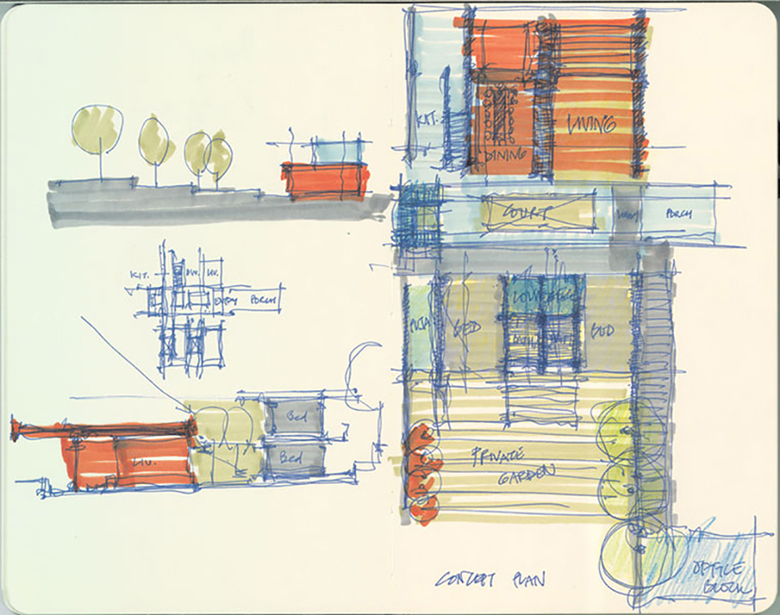 This hand-drawn rendering of studios for the Djerassi Resident Artists Program expresses the main ideas of the project before design development. In particular, each studio is a separate structure that sits underneath a large shelter propped up by skinny columns; they each look down the slope to the view beyond. In the final execution the number of studios is reduced to four from five; the columns sit between the boxes rather than in front of them; angled walls at the edge of the boxes offer additional shade; the canopy is simplified to only one pitch; and the large glazed areas are reduced to sliding glass doors. Nevertheless the initial ideas are clearly carried through to completion.