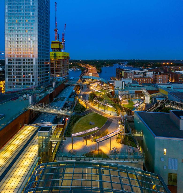 A similar price tag is expected once the Redi complex in the Kalasatama neighborhood is completed. Designed by architect Pekka Helin, also from Helsinki, Redi includes the tallest residential building in Finland, the 134-meter Majakka tower. The 35-story tower with 283 residences will be joined by seven other towers, as well as a hotel and offices. At the base of the towers, three of which have been built at this point, there is a shopping center. Redi is a classic example of a TOD (transit-oriented development), in this case centered around the Kalasatama Metro Station, which is located on the third floor and is directly accessible from Redi. Additionally, there is a nice public park on its roof.
