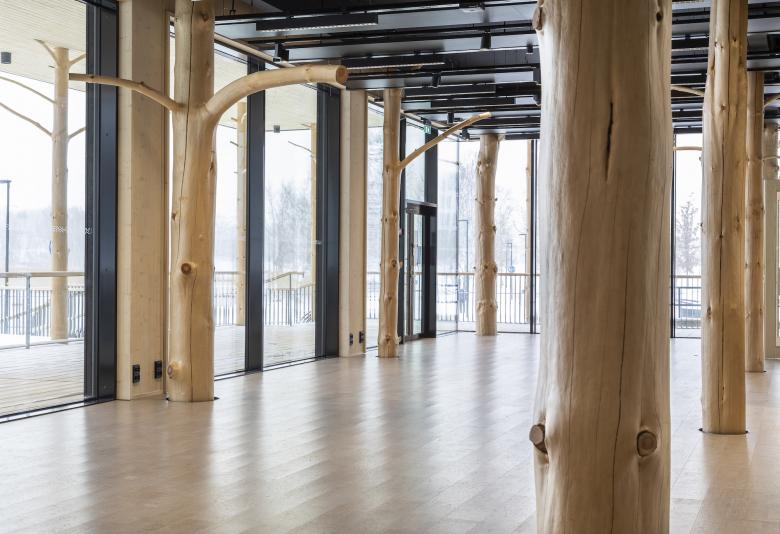 The “Little Finlandia” substitute pavilion was designed by Jaakko Torvinen, Havu Järvelä, and Elli Wendelin in collaboration with Pekka Heikkinen and Architects NRT with circular economy, sustainability, and reusability in mind. While floor-to-ceiling glass lines the front, a colonnade runs along the length of the hall, with tree trunk-columns with protruding branches. Inside, these former trees create a little “forest.” The modular hall is meant to be disassembled after three years, once the Aalto building reopens, after which it will be reused as a school or day care at a different location.