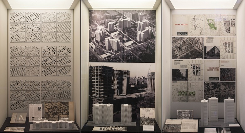 Very few people would argue for the densities of tenements (1,000 pp/acre in 1900 and 87% lot coverage) nor of towers in the park like Co-op City in the Bronx (51 pp/acre and 15% coverage). Somewhere between these extremes is Penn South from 1962, where the affordable housing lottery is currently underway. Are its densities (300 pp/acre and 20% lot coverage) any better? If, as the exhibition does, we take the input of then-contemporary experts into account, that "sweet spot" is around 500 pp/acre; according to both Jane Jacobs, author of Death and Life of Great American Cities from 1961 and Lawrence Halprin, the landscape architect who produced New York, New York, the 1968 "study of the quality, character, and meaning of open space in urban design." Which begs the question they didn't answer: if 500 pp/acre works for NYC, what about the density of built area, of lot coverage?