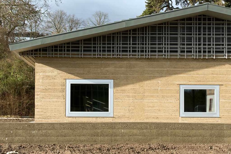 Martin Rauch (Lehm Ton Erde Baukunst): As the building was a combination of timber and earth, fast construction time on site was important, so that we could get the large, overhanging roof on as quickly as possible. Tha's why we opted to prefabricate the components. We were able to produce the rammed earth components in our factory, independent of weather influences. Assembly on site was therefore very quick and we were able to keep to the very tight time schedule.