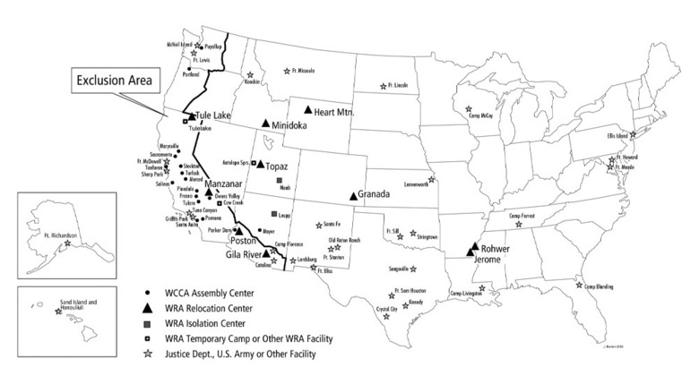 Locations of WWII internment camps are marked with triangles; Poston is located in Arizona, in the lower-left corner. (Image: National Parks Service)