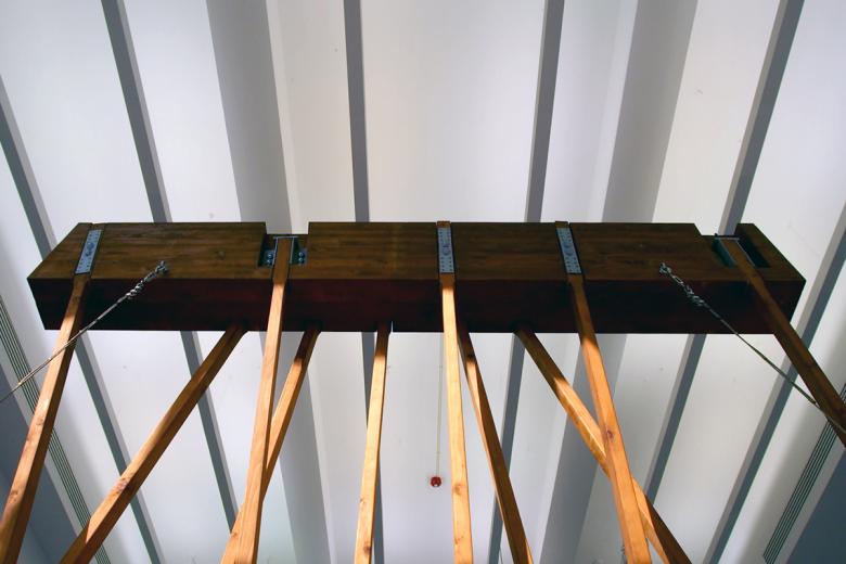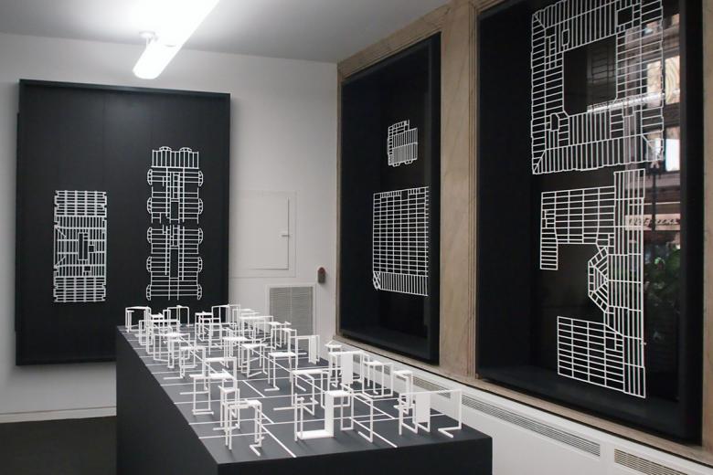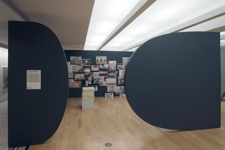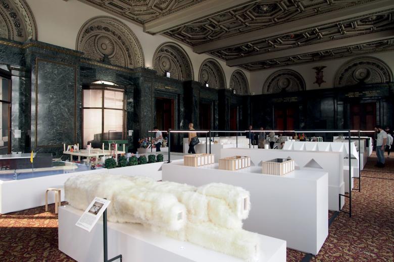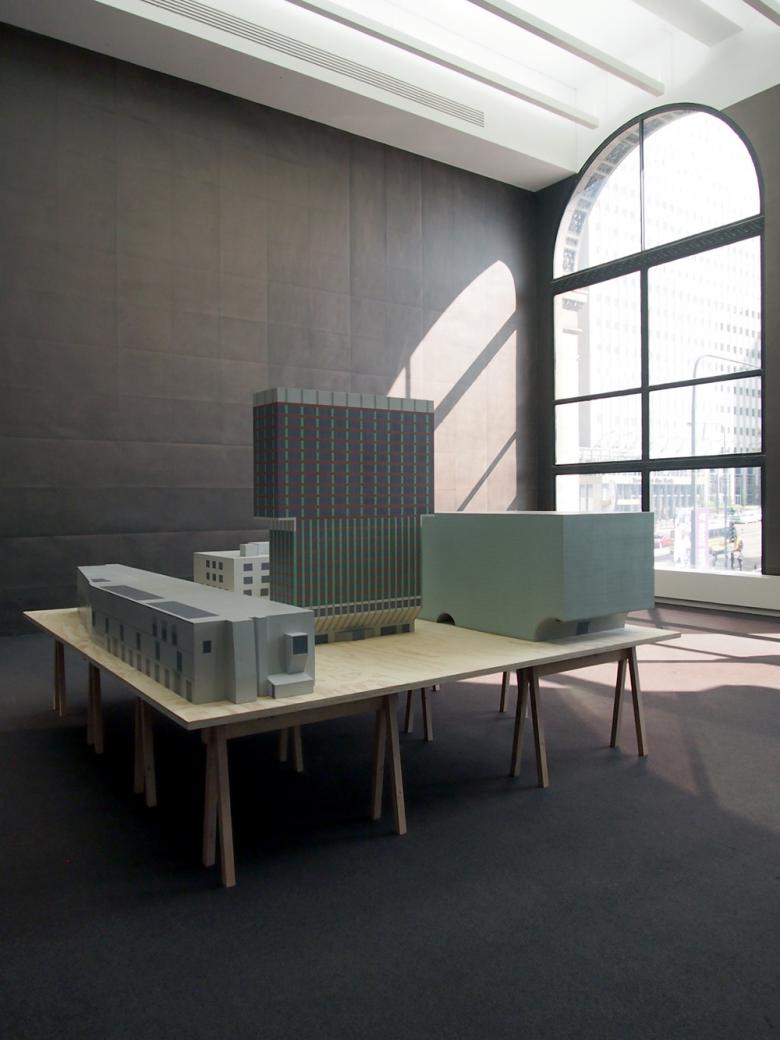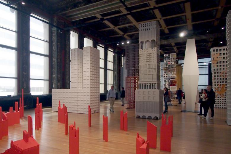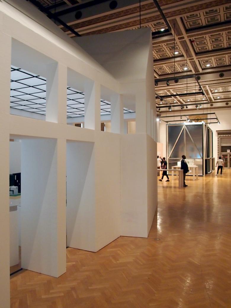 #26 – Exhibit Hall: "Super Models" by Sylvia Lavin in the foreground and "(Study for) Chapel for Scenes of Public Life" by baukuh and Stefano Graziani in the distance. The large spaces on the fourth floor enable large-scale installations.