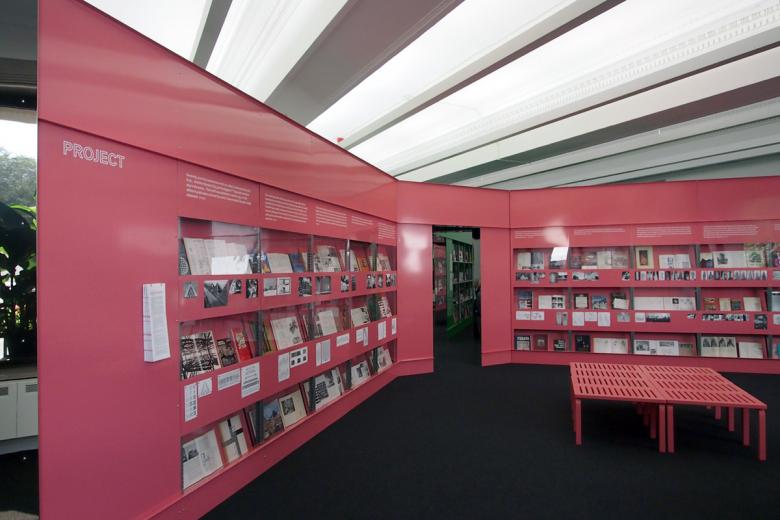 #3 – "Rooms for Books" by MG&Co. Next to the lobby is a room subdivided into four triangular spaces through the insertion of four diagonal walls. A bookstore fills one, while the others include an archive of books by participating architects, a room for talks and production, and a display of books (seen here) from the library of husband-wife architects Stanley Tigerman and Margaret McCurry.