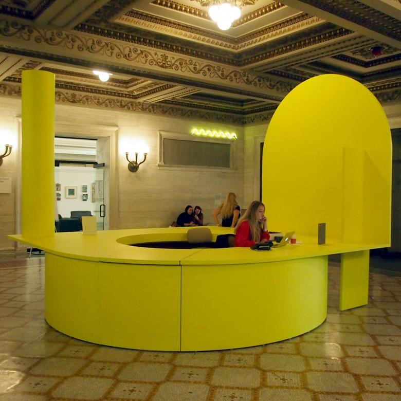 #5 – Randolph Street Lobby: "Entrance Installation" by Ania Jaworska. This bright yellow installation literally covers an existing information desk, doing so with an ironic treatment of an arch (solid instead of open) and column (supporting nothing) that recalls Postmodern architecture from decades ago.