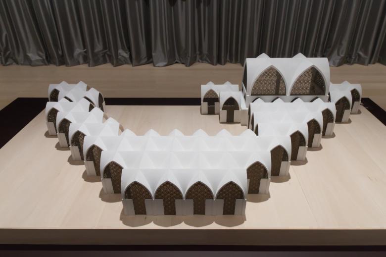 As the principal architect of the Capital Development Authority in Islamabad ("City of Islam"), the new city laid out by Constantinos A. Doxiadis in the 1960s (a portion of the "New Cities" section addresses Islamabad), Anwar Said devised a series of prototypical mosques for the city's residential districts. The small, medium, and large ("A," "B," and "C" type) mosques could be inserted appropriately depending on the character of the "sector" where they would be located. Ahle-Hadith Mosque is one of the largest types, with a diamond-shaped plan holding a large courtyard in its center. A square module with groin vaults is repeated to form the covered spaces, with the double-height main hall made from four doubled modules. The glazed exterior arches feature precast concrete screens that are beautifully captured in the model.