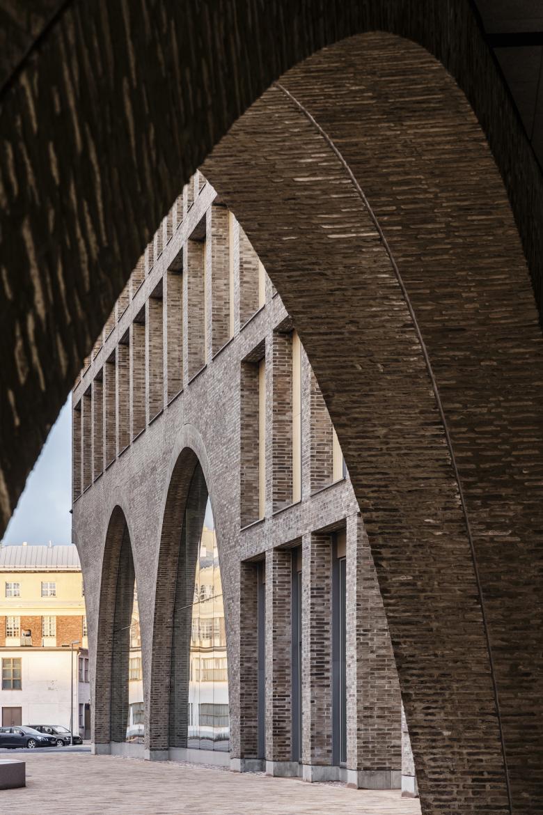 The Urban Environment House was designed by Lahdelma & Mahlamäki architects, an established local firm best known internationally for their design of the POLIN Museum of the History of Polish Jews in Warsaw, the 2013 building that "sits alongside the memorial to the Jewish Ghetto Uprising and tells the story of Polish Jews." That simple cubic building is traversed by a ravine-like gap that serves as a public passage connecting the building to its surroundings. Behind its shell, the building occasionally opens to the outside via window slits. The interior is crisscrossed by massive curved walls that cut through the building forming a main hall in the center; a bridge symbolically brings together past and future.