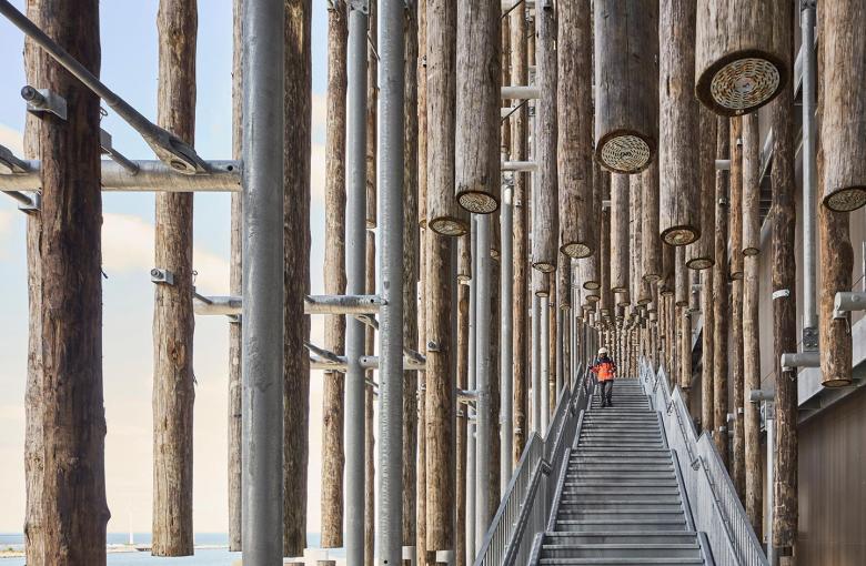 But Thomas Bonde-Hansen of Gottlieb Paludan Architects presented a good built example for new urban uses of wood: the BIO4 building at the Amager Power Station in downtown Copenhagen. The massive biomass plant needed a careful design since it can even be seen from the Little Mermaid, Copenhagen’s main tourist spot. The Danish capital is aiming to be the "world’s first CO2-neutral city" by 2025 and therefore its power stations are being turned into "green" urban buildings. The facade of BIO4 is covered with hanging tree trunks, which create surprising aesthetic and spatial experiences. The trunks' lifetime is more than 30 years, and if the trunks are worn out they will be ground to wood chips and fired in the plant’s furnaces. Behind the trunks are gold-colored metal sheets cladding the building, and the top of the boiler house is covered in gold-colored cassettes which reflect the light. A viewing and information platform at the top make BIO4 a self-declared "beacon for sustainable heat production" right in the city. Visitors move through the tree trunks via a spectacular staircase, with glimpses of the machinery of energy production.