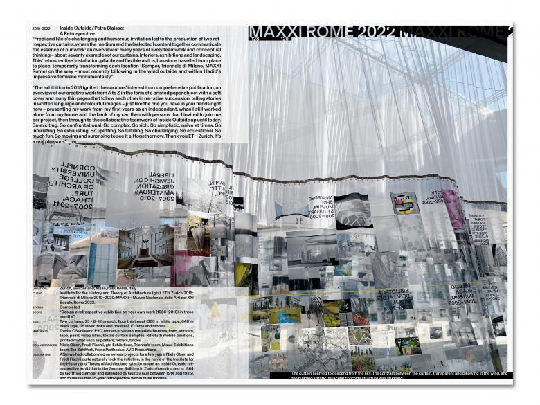 It was a great conversation, sometimes humorous but always illuminating, especially in regard to the book's origins. Art Applied can be traced back to 2018 and the gta exhibition on Petra Blaisse / Inside Outside that Fischli and Olsen curated. Instead of using the small, glass-walled gta gallery at ETH's Hönggerberg campus, Inside Outside / Petra Blaisse: A Retrospective took over the central hall of the historic main building on ETH's Zentrum campus. The setting was appropriate, not only due to its size and scale, but because the building was designed by Gottfried Semper, the 19th-century German architect and dean of the architecture school at ETH who “argued that architecture is based on low decorative arts,” the curators/editors write in the introduction to Art Applied, “and borrows from crafts such as pleating and weaving.” Fittingly, Blaisse's studio displayed their projects on two immense curtains hung within the large colonnaded hall. Although site-specific, the curtains were subsequently sent to Milan for the Triennale in 2019 and then, following the pandemic, to MAXXI in Rome in 2022.