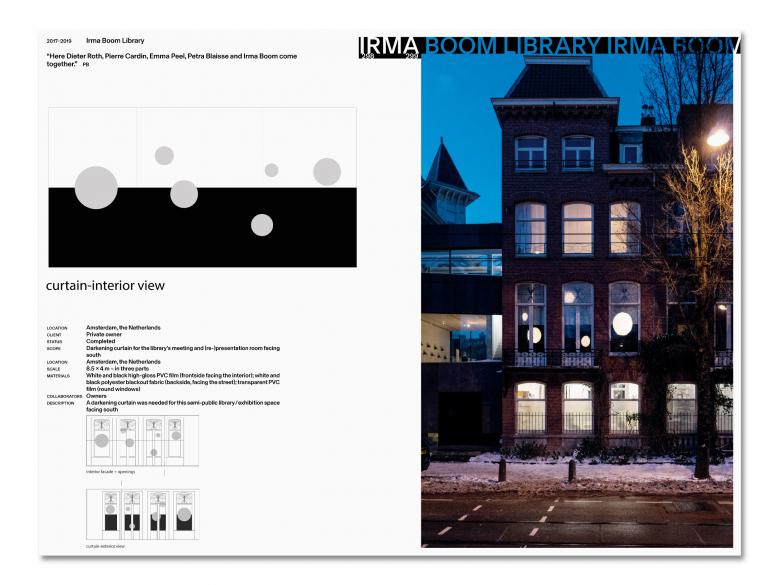 Boom, it turns out, was a client of Blaisse's. Her library, for which Blaisse designed a “darkening curtain for the library's meeting and (re-)presentation room facing south,” is found starting on page 298 in the book's reverse chronological presentation of selected projects. This presentation method means that the selected projects begin near the present, on page 128, with the exhibitions in Zurich/Milan/Rome, and end in 1987, on page 873, with the stage curtain and other interior elements for the Nederlands Dans Theater in The Hague. The latter — that is to say the earlier — project is notable as Blaisse's first project as an independent designer, coming after years working as an assistant at the Stedelijk Museum in Amsterdam, but also as the first major commission for Rem Koolhaas and OMA. (Regardless of these markers of note, the building was demolished without protest in early 2016.)