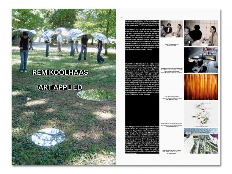 Although the transparency of the curtains and the movement of the films could not be translated directly into book form, Art Applied does an excellent job of presenting the diverse and voluminous output of Inside Outside over the course of nearly 40 years. Some of this success can be attributed to the design of Teo Schifferli, who uses text sparingly but effectively in the project presentations and uses photographs, sketches, drawings, film stills, and other images in a way that gives each project equal weight, be they curtains, a landscape, or some other project type. Schifferli's involvement is somewhat surprising, given that Blaisse's first two books — Movements 25%: Introduction to a Working Process, the catalog for an exhibition at the Storefront for Art and Architecture in New York in 2000; and the eponymous Inside Outside | Petra Blaisse, published by NAi and Monacelli in 20007 — were designed by Irma Boom, the bookmaker also based in Amsterdam.