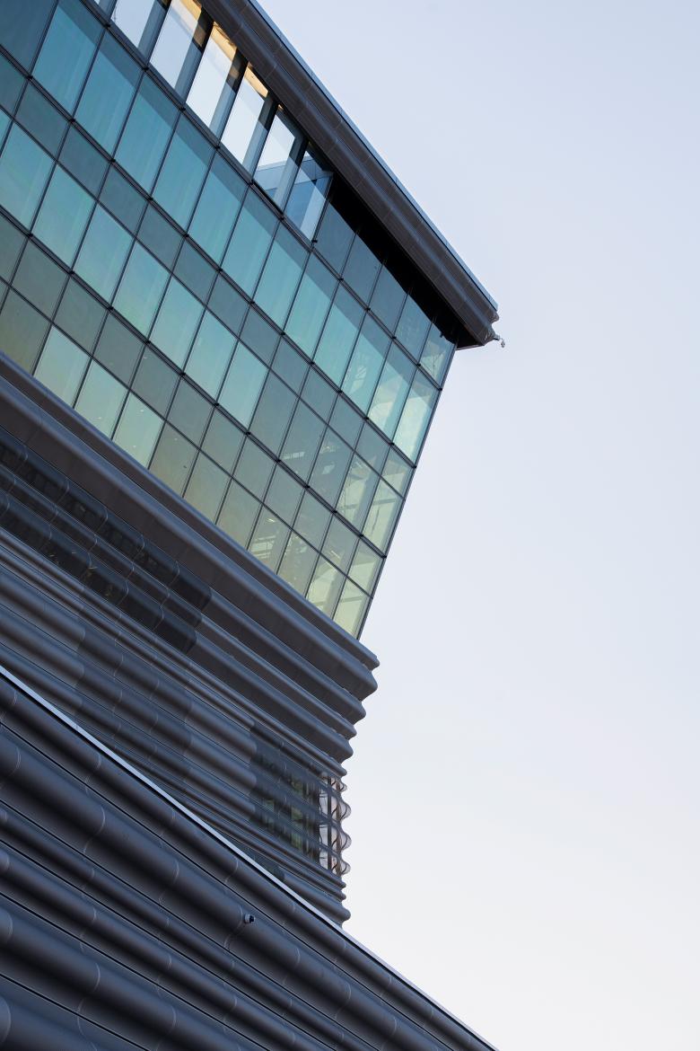 The museum is complete. Although it won’t be inaugurated until the fall, its qualities can be deciphered. The 13-story building has an odd shape and an equally odd façade. It is shaped like a long, thin skyscraper covered in a curved façade completely made of grey perforated metal panels that create an iridescent effect. At first glance, the most striking aspect is the building’s top, tilted like a lambda. It seems to bow to the nearby Opera, but the architects simply call it an “urban gesture.” Yet the form is not genuinely chosen for Oslo, as Ábalos & Herreros used the same nodding shape at their Woermann Hybrid Complex at Las Palmas de Gran Canaria, Spain. In Oslo, the building is surrounded by water on three sides but it uses this excellent position to less effect compared to the Opera. The big advantage of the tall building is that the neighboring island will remain devoid of buildings and therefore be turned into an urban square next to the Oslo fjord.