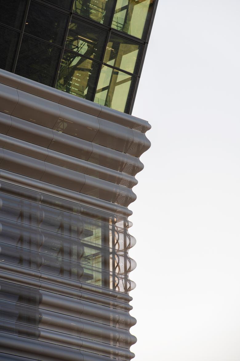 Assuming that most visitors to the building do not just rush up and down for the upstairs views, food, and drinks, but they buy a ticket and delve into Munch’s aesthetic world, they will ride a cascade of escalators up and through the museum, not unlike the Pompidou Center in Paris. This movement of people in a museum by means of escalators is architecturally celebrated: If halls are taller, the escalator will skip one floor. The architects want the building to be “living organism and not just a mega-depot.” A glass joint is reserved as an airy circulation space between the lower base containing auditoria and shop and the long, thin row of exhibition halls. None of them feature any daylight, making the façade an important and difficult part of the building. The choice of the aluminum screen unfortunately means that views out from the hallways are pixelated, even from the viewing platform, turning views into pointillist impressions. The façade is irregularly checkered with four different shades of grey – a pattern the architects use in almost all of their projects.